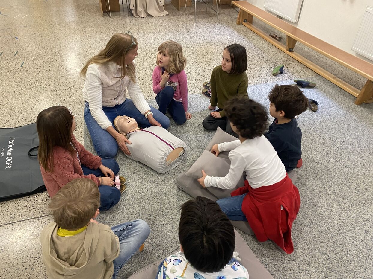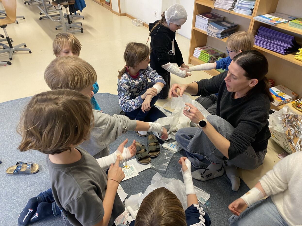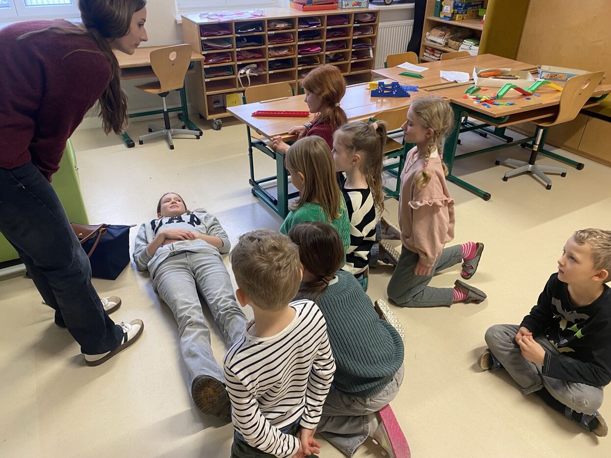 Im Stationenbetrieb lernten die Kinder verschiedene Verletzungsarten und die damit verbundenen Verbände kennen und durften diese auch gegenseitig anlegen. In einer weiteren Station übten die Schüler:innen die Herzdruckmassage, auch unterstützt durch ein sehr flottes Lied. Dabei trainierten sie die Intensität des Druckes und die Geschwindigkeit der Anwendung an einer Puppe, um einen Menschen möglichst gewinnbringend Erste Hilfe leisten zu können. In der dritten Gruppe wendeten die Schüler und Schülerinnen die W-Fragen bei einem Anruf Rettung, Polizei bzw. Feuerwehr an. Außerdem wurden „verunglückte Patient:innen“ in die stabile Seitenlage gebracht.