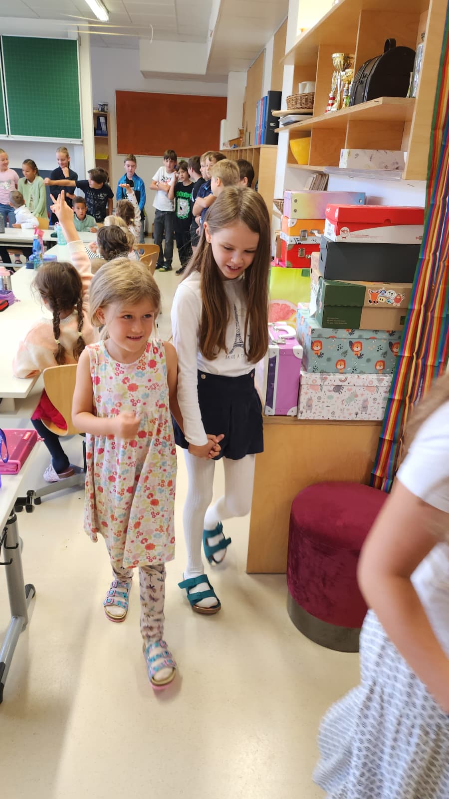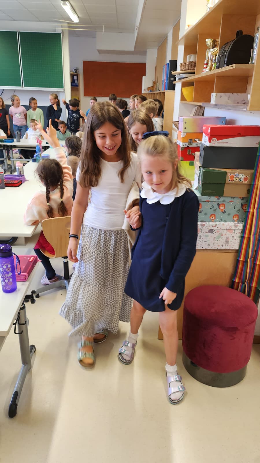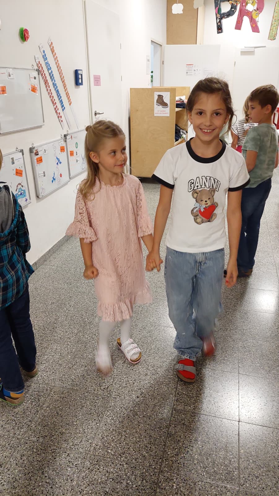 Bei einem ersten Kennenlernen führten die "alten Hasen" die Schulanfänger:innen durchs Schulhaus, erklärten wichtige Stationen und boten ihre Unterstützung für die kommende Zeit an. So haben die Jüngsten nun erfahrene Begleitung an ihrer Seite.