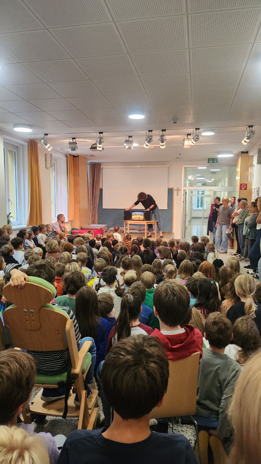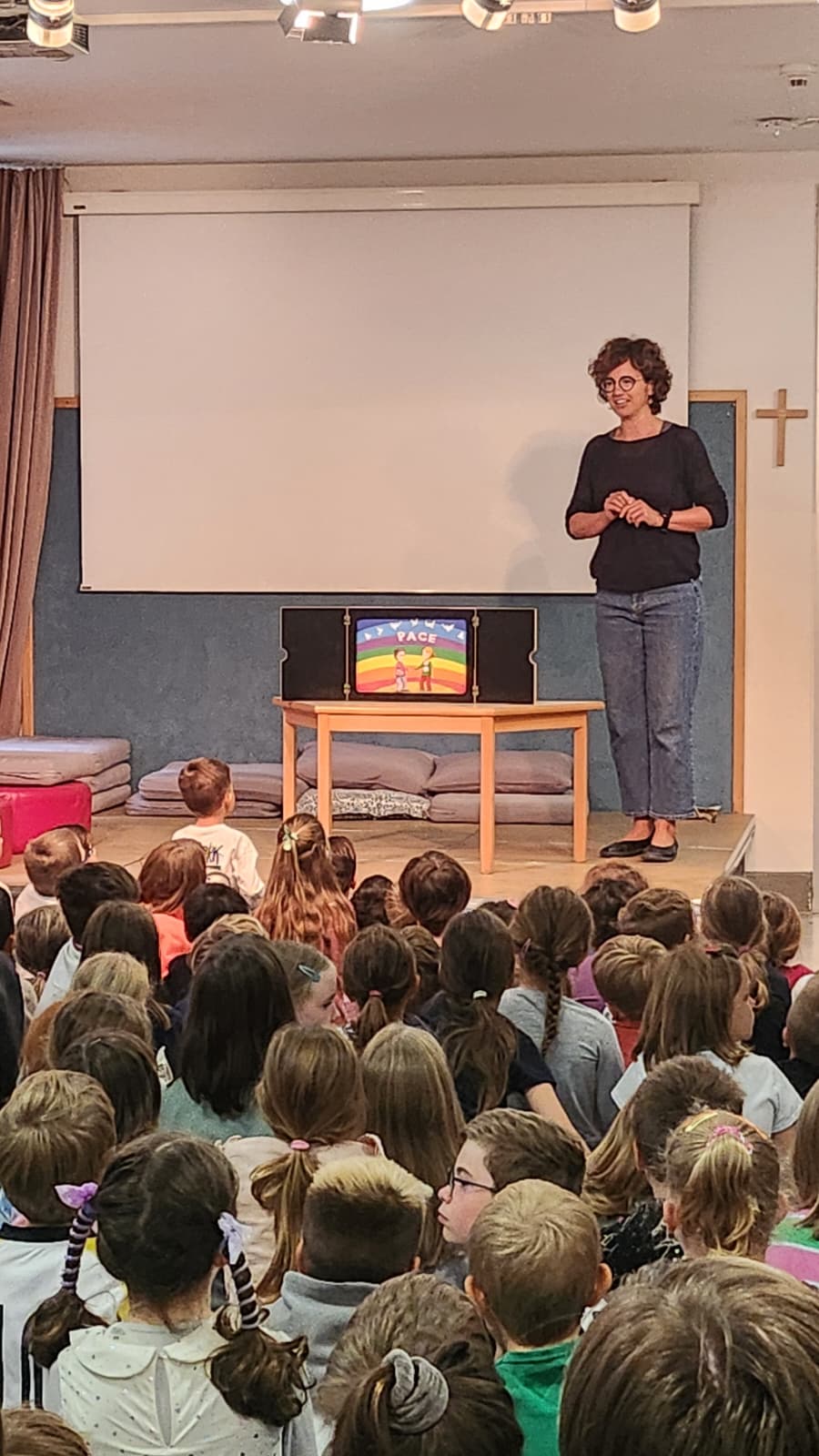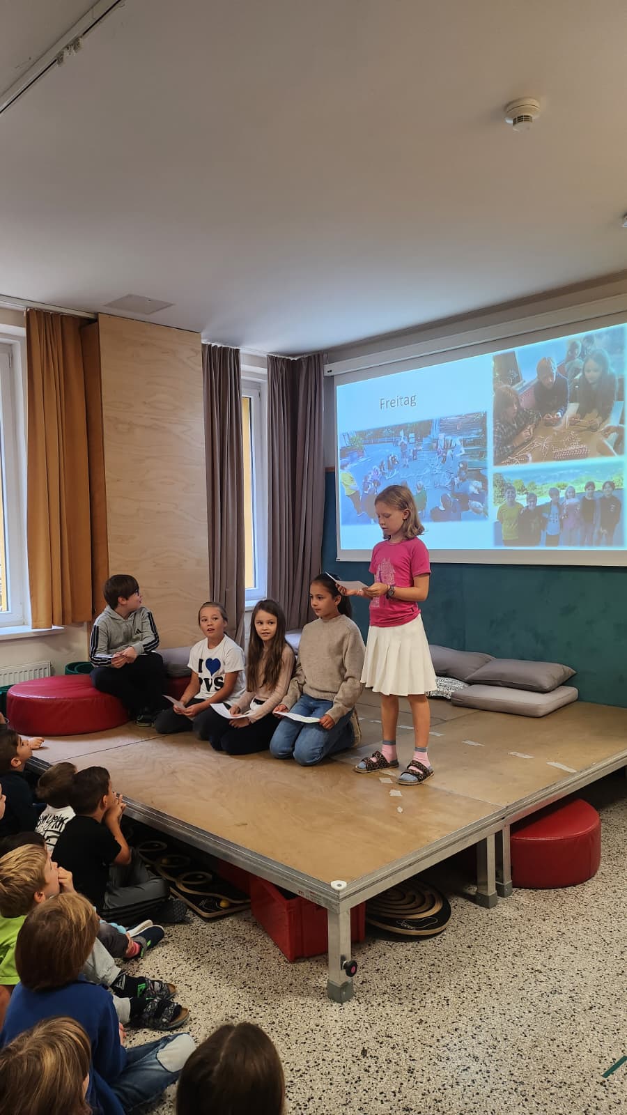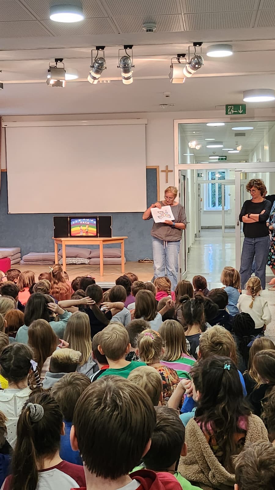 Heute war der MoMo ganz farbenfroh. Zum einen erzählten unsere Kinder der 4. Klasse von ihrer bunten Projektwoche und im Anschluss präsentierten Michi und Susi den Kindern ein Kamishibaibild in Regenbogenfarben zum Thema "Frieden", denn gestern war der internationale Tag des Friedens.